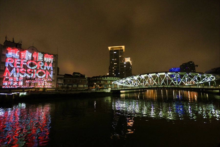 近日,上海苏州河畔悄然掀起一场岭南艺术风潮。林风眠的《青衣仕女》在水波中亭亭玉立,关良的《三打白骨精》跃然水面,陈永锵的《鱼跃图》在夜色中泛起灵动的涟漪……岭南美术经典化身为流动的光影,为申城平添一抹南国韵味。